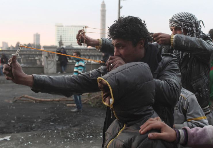 Protesters use slingshots to launch stones at riot police during clashes near Qasr el-Nil bridge, in Cairo January 29, 2013. Egypt’s army chief said political unrest was pushing the state to the brink of collapse – a stark warning from the institution that ran the country until last year as Cairo’s first freely elected leader struggles to curb bloody street violence. REUTERS/Asmaa Waguih (EGYPT – Tags: POLITICS CIVIL UNREST TPX IMAGES OF THE DAY)