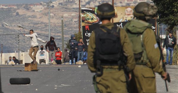 epa03592128 Palestinian demonstrators hurl stones at Israeli soldiers during clashes at Huwwara checkpoint near Nablus, the West Bank, 20 February 2013. EPA/ALAA BADARNEH