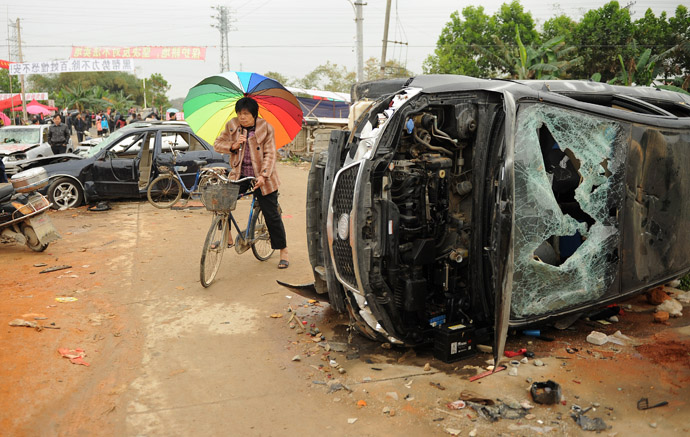 In this photo taken on March 2, 2013 a resident cycling between smashed and overturned cars after civil unrest in the village of Shangpu in China’s southern Guangdong province. Villagers in southern China were locked in a stand-off with authorities on March 3 and were demanding democratic polls after a violent clash with thugs linked to a local official over a land transfer. Just over a week ago, residents of Shangpu in Guangdong province fought with scores of attackers whom they claimed were sent by the village communist party chief and a business tycoon after they protested against a land deal. AFP PHOTO / Peter PARKS