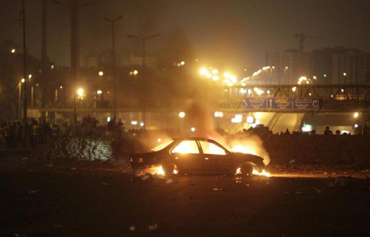 A car that members of the Muslim Brotherhood and supporters of deposed Egyptian President Mohamed Mursi say was burnt by police and plain-clothed people is seen during clashes in Nasr city area, east of Cairo July 27, 2013. The Muslim Brotherhood said at least 31 people died early Saturday after security forces attacked a protest by supporters of deposed President Mohamed Mursi in Cairo. REUTERS/Asmaa Waguih (EGYPT – Tags: POLITICS CIVIL UNREST)