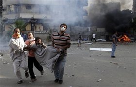 Egyptian protesters carry an injured comrade from the site of clashes with security forces, unseen, near the U.S. embassy in Cairo, Egypt, Friday, Sept. 14, 2012, as part of widespread anger across the Muslim world about a film ridiculing Islam’s Prophet Muhammad. (AP Photo/Khalil Hamra)