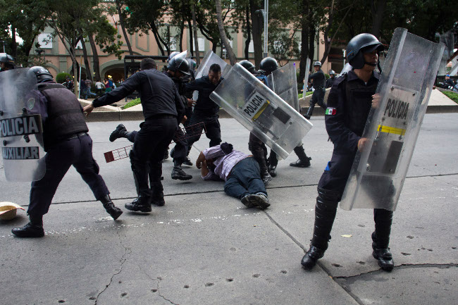 MÉXICO, D.F., 11SEPTIEMBRE2013.- Maestros de la CNTE, se enfrentaron a golpes con elementos del cuerpo de Granaderos sobre la avenida Reforma a la altura de la Torre Mayor. FOTO: ENRIQUE ORDÓÑEZ /CUARTOSCURO.COM