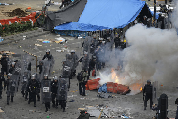 Riot police enter the Zocalo to clear out any remaining striking teachers, Friday, Sept. 13, 2013. Minutes after a late-afternoon government deadline for teachers to leave from the city’s main plaza, where they have camped out for weeks, riot police moved in, firing tear gas and ducking hurled rocks in a confrontation culminating weeks of protests against an education reform. (AP Photo/Dario Lopez-Mills)