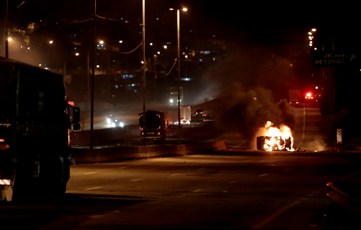 View of a car on fire in a highway in Sao Paulo, on October 28, 2013, following disturbances triggered by the accidental fatal shooting –on the eve– of a 17-year-old boy by the police. Some 500 youths were involved in the latest disturbances which saw vandals torching at least two trucks and two buses and forcing the temporary closure of a local highway. AFP PHOTO / Miguel SCHINCARIOL