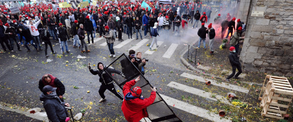 Protestors wearing red bonnets, members of several economic sectors of the Brittany region, fight with anti riot police during a demonstration against job losses and against the government’s « eco-tax », a controversial environmental tax on heavy goods vehicles, on November 2, 2013 in Quimper, western France. Brittany’s farming and food industry, which accounts for a third of local jobs, has been badly hit by France’s economic crisis. AFP PHOTO / JEAN-SEBASTIEN EVRARD