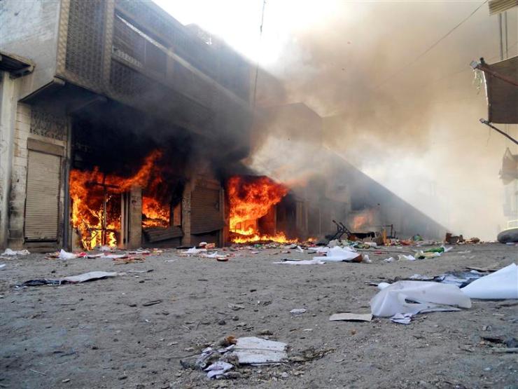 Stalls at a market burn after it was set on fire during sectarian clashes in Kohat, Khyber Pakhtunkhwa province November 18, 2013. REUTERS/Syed Shah
