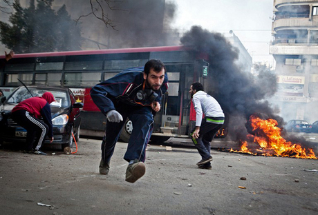 Supporters of Egypt’s deposed president Mohamed Morsi run for cover from tear gas fired by riot police during clashes in the northeastern part of Cairo’s Nasr City district on January 3, 2014. Demonstrators threw stones and set fire to tyres in the street after an Islamist alliance backing Morsi called for demonstrations ahead of a new hearing in the former president’s trial on January 8. AFP PHOTO/VIRGINIE NGUYEN HOANG