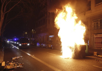 GRA377. BARCELONA, 19/02/2014.- Contenedores ardiendo por las calles de Barcelona, durante los altercados que se han producido esta noche provocados por el desalojo de la casa okupa La Carbonería, situada en el Eixample de la capital catalana. EFE/Alejandro García.