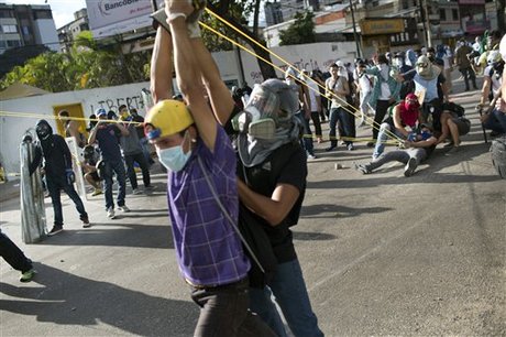 Demonstrators use a giant slingshot to launch stones at Bolivarian National Guards during clashes in Caracas, Venezuela, Sunday, March 2, 2014. Since mid-February, anti-government activists have been protesting high inflation, shortages of food stuffs and medicine, and violent crime in a nation with the world’s largest proven oil reserves. (AP Photo/Rodrigo Abd)