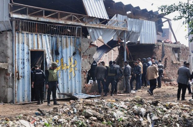 A member of Egypt’s security forces looks at a body of a militant on the ground after gun battle that lasted several hours in Arab Sharkas village, north of Cairo, Egypt, Wednesday, March 19, 2014. A raid by Egyptian police, military and special forces on a suspected bomb factory outside of Cairo turned into an hourslong gun battle with insurgents who detonated car bombs, fighting that killed two military officers and five militants, the Interior Ministry said Wednesday. (AP Photo/Mohammed Al-Law)