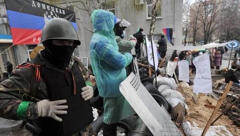Pro-Russia activists guard a barricade outside a regional police building seized by armed separatists in Slavyansk on April 13, 2014. Ukraine on Sunday launched an