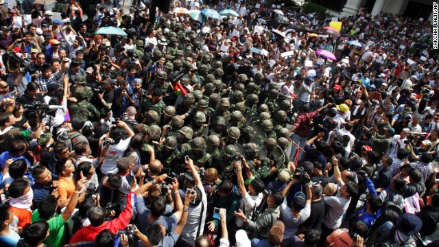 Thai soldiers holding riot shields are surround by anti-coup protesters during an anti-coup demonstration in Bangkok, Thailand, Sunday, May 25, 2014. Gen. Prayuth Chan-ocha in Thailand’s ruling junta warned people Sunday not to join anti-coup street protests, saying normal democratic principles cannot be applied at the time, as troops fanned out in central Bangkok to prevent rallies. (AP Photo/Sakchai Lalit)