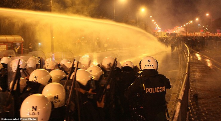Police use a water cannon to disperse groups of masked youth as clashes broke out between hooligans and police amid Independence Day celebrations in Warsaw, Poland, Tuesday, Nov. 11, 2014.. The violence has turned into a yearly ritual on the holiday in recent years.(AP Photo/Czarek Sokolowski)