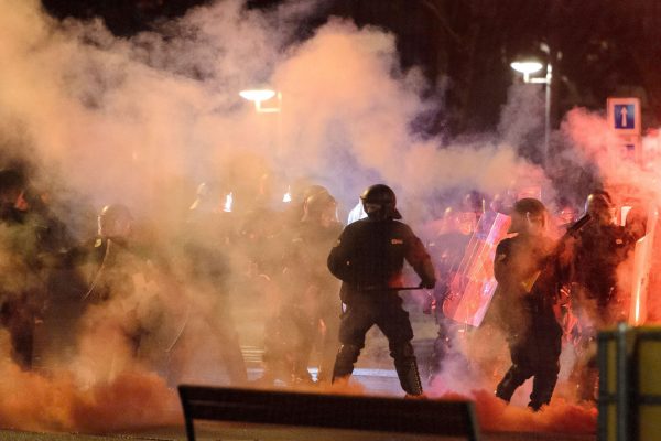 Riot police clash with demonstrators during a protest against an Organization for Security and Cooperation in Europe (OSCE) ministerial meeting on December 5, 2014 in Basel. Ukraine needs « a ceasefire not in name, but ceasefire in substance, » Ukraine’s foreign minister Pavlo Klimkin told reporters in Switzerland on the sidelines of the OSCE meeting focused on the crisis in Ukraine. AFP PHOTO / FABRICE COFFRINI