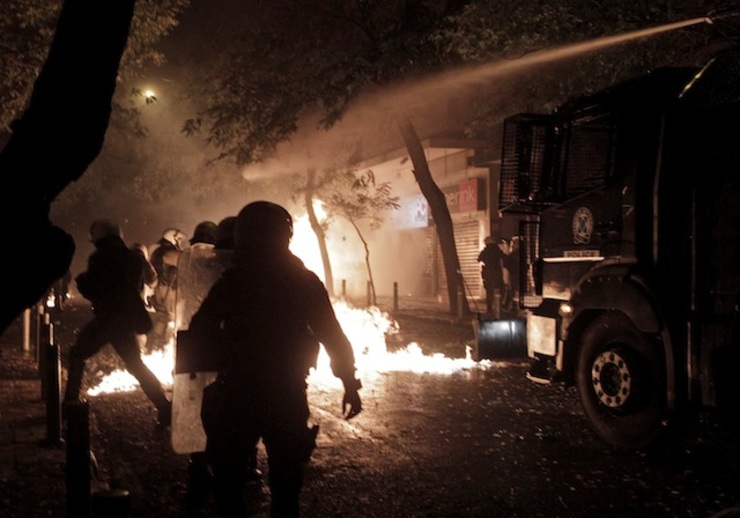 epa04518029 Riot policemen try to avoid a molotov cocktail as a water canon throws water to protesters during clashes following a rally on the anniversary of the killing of teenager Alexis Grigoropoulos by a Greek police officer, in Athens, Greece, 06 December 2014. The protests are also in support of Nikos Romanos, a friend of Grigoropoulos who witnessed his death, who continues his hunger strike for the 27th consecutive day. Romanos, a 20-years-old anarchist convicted for armed robbery commited in 2013, began his protest after he was denied educational furlough to attend classes for a course at a Technological Educational Institute, where he had gained a place after sitting. EPA/YANNIS KOLESIDIS