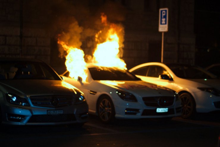 Ein brennendes Auto in der Zuercher Innenstadt in der Nacht auf Samstag, 13. Dezember 2014. Mehrere hundert Personen haben am Freitagabend und Samstagmorgen in der Zuercher Innenstadt randaliert. Sie griffen Polizisten an, schlugen Schaufenster ein und zuendeten Autos an. Die Polizei ging mit Wasserwerfern gegen sie vor. (KEYSTONE/Jan Mueller)