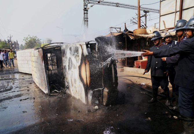 Mumbai: Firefighters put out fires on vehicles that were set ablaze by irate commuters at Diva Station in Mumbai on Friday. Rail traffic was disrupted following violent public protests at the Central line. PTI Photo(PTI1_2_2015_000047B)