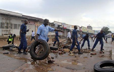 Burundi policemen clear a barricade set up by protestors opposing President Pierre Nkurunziza from running for a third term, in the capital Bujumbura, April 17, 2015. REUTERS/Jean Pierre Aime Harerimana