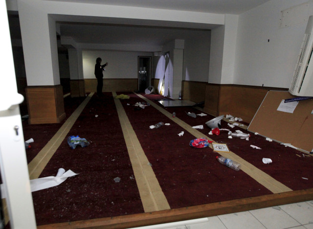A picture taken on December 25, 2015 shows a devastated prayer room in Ajaccio, after protesters vandalized it and tried to set fire to copies of Koran, near a working-class neighbourhood of Ajaccio where two firefighters and one police officer were injured last night during clashes, the French police and prefecture said. / AFP / Pierre-Antoine FOURNIL