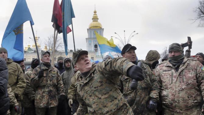 Commander of a volunteer battalion Mykola Kokhanivsky throws a stone against the window of an office that belongs to Ukraine tycoon Rinat Akhmetov in Kiev, Ukraine, Saturday, Feb. 20, 2016. The activists blame Akhmetov of supporting corruption and pro-russian separatists. The anniversary of a massacre in which more than 100 people were killed by sniper fire during massive protests two years ago. (AP Photo/Efrem Lukatsky)