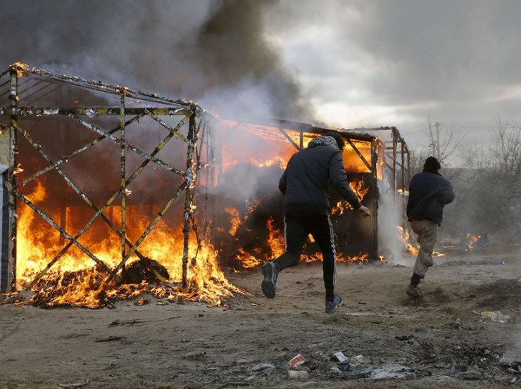 Migrants run past burning tents in a makeshift camp near Calais, France, Monday Feb. 29, 2016. French authorities have begun dismantling part of the sprawling camp locally referred to as « the jungle » where thousands are hanging out, hoping to make their way to a better life in Britain. (AP Photo/Jerome Delay)/XJD114/850962066700/1602291846