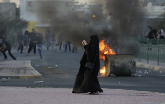 A Bahraini woman photographs riot police approaching as anti-government protesters clash with riot police firing tear gas after the funeral of an 18-year-old wanted youth in the western village of Shahrakan, Bahrain, Tuesday, April 5, 2016. Thousands of Bahrainis marched in the politically charged funeral procession for Ali Abdulghani, who died of severe injuries sustained while fleeing arrest. (AP Photo/Hasan Jamali)