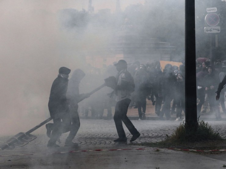 Protesters clash with French riot police during a protest against the government’s labour reform on May 12, 2016 in Paris. France’s already unpopular Socialist government faces a no-confidence vote on May 12, 2016 after it bypassed parliament and forced through a labour reform bill that has led to two months of demonstrations. Unions have called for more demonstrations on the same day to coincide with the vote of no confidence. AFP PHOTO / JOEL SAGET / AFP PHOTO / JOEL SAGET