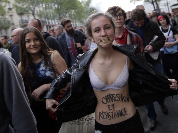 A demonstrator shows a painting on her body reading « Oppression and Resistance » during a protest against Labor Law as the Socialist government decided to force the bill through Parliament without a vote, in Paris, Thursday, May 12, 2016. France’s government is facing a major test as lawmakers hold a no-confidence vote, prompted by a deeply divisive labor law allowing longer workdays and easier layoffs. (AP Photo/Christophe Ena)/XENA103/3463767407/1605121619