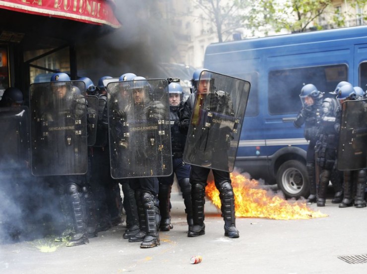 Frencg gendarmes protect themselves with their shields after receiving a petrol bomb as they clash with protesters during a demonstration after the French government used the constitution’s Article 49,3 to bypass parliament and force through a controversial labour reform bill, on May 17, 2016, in Paris. French President Francois Hollande said on May 17 the battle against unemployment was not yet won as he vowed to stick with his controversial attempts to reform the labour market. The reforms have sparked two months of street protests and led to an unsuccessful attempt to bring down the government. AFP PHOTO / THOMAS SAMSON / AFP PHOTO / THOMAS SAMSON