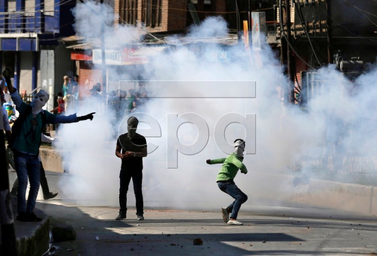 epa05319447 A Kashmiri Muslim protester throws a stone towards Indian police and paramilitary soldiers amid tear gas during a protest against the Indian government in downtown Srinagar, the summer capital of Indian Kashmir, 20 May 2016. Police fired tear gas canisters and rubber bullets to disperse the Kashmiri Muslim protesters who were protesting after Friday congregation prayers outside Kashmir’s main mosque, Jamia Masjid. EPA/FAROOQ KHAN