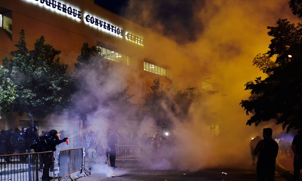 - Police in riot gear combat protesters at Albuquerque Trump rally