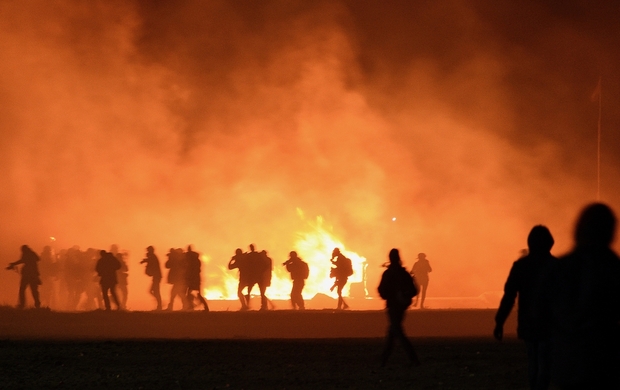Smoke billows as migrants start a fire during clashes with police at the « Jungle » migrant camp in Calais, northern France, on October 23, 2016 on the eve of the camp’s planned evacuation.